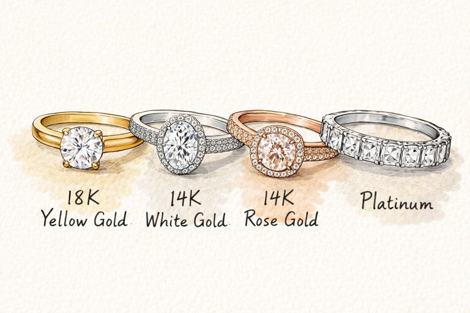 When designing a custom jewelry piece, one of the most important decisions you’ll make is the type of metal. Beyond appearance, your choice affects durability, maintenance, cost, and how the piece will age over time. From 10K to 18K gold to platinum, and from white to yellow tones, each option offers something unique.